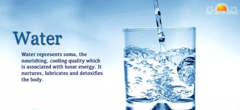 Water aids digestion, cools and balances Pitta dosha, sustains Kapha, and counteracts the dryness of Vata. It nourishes, lubricates, and detoxifies the body by flushing out toxins through urine.