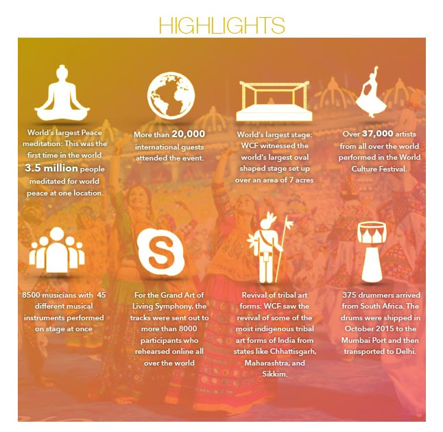 सभी संस्कृतियों के लोगों को एक साथ लाने और विविधता में एकता का उत्सव मनाने के उद्देश्य से यमुना नदी के किनारे 155 देशों से 35 लाख लोगों की उपस्थिति इस भव्य सांस्कृतिक महोत्सव में हुई।